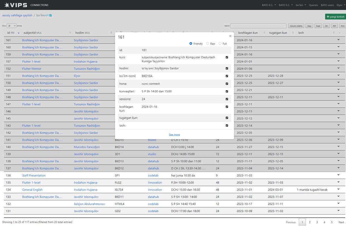 Ulardan hodimlar, talabalar, kurslar, to'lovlar, kirimlar, chiqimlar, qarzdorlar va hokazo. Agarda Baza platformasida qaysidur malumot uchun bo'lim mavjud bo'lmasa, platformaga siz uchun qo'shib beramiz.
