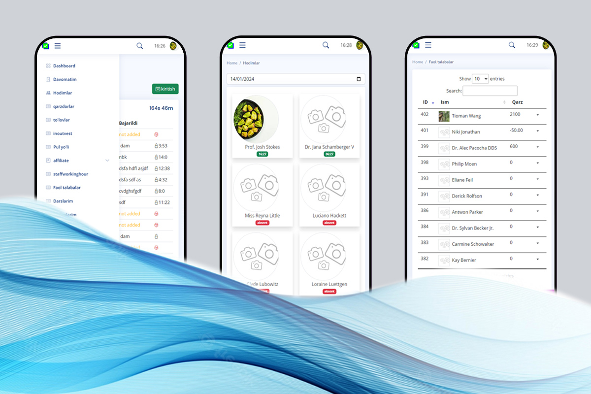 Barcha hodimlarda davomat olish imkoniyati mavjud. Ammo, talaba davomatini olish imkoniyati o'qituvchilardagina mavjud. Qabulxonachida esa talabalar ro'yxati va qarzlari ko'rinadi.